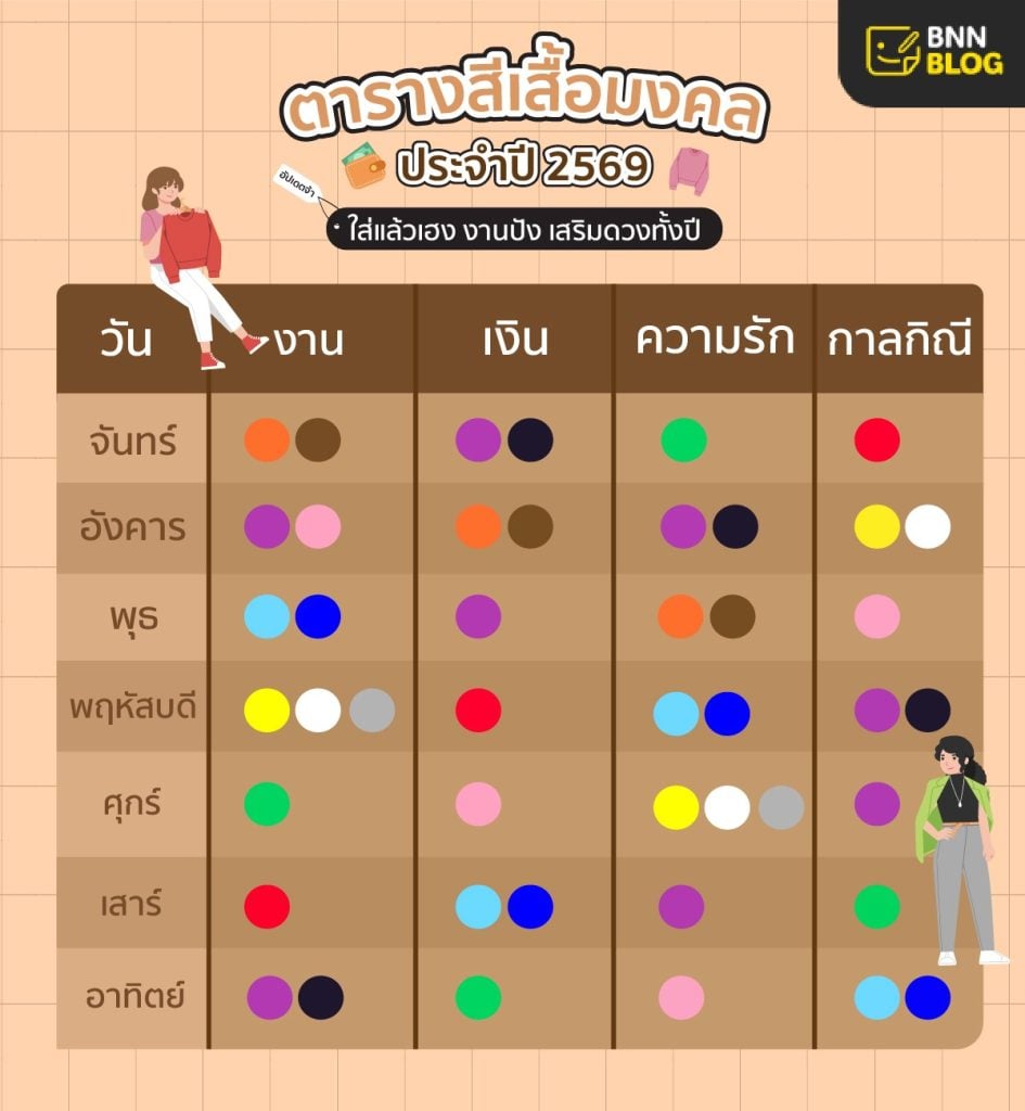 💡ตารางสีเสื้อมงคลปี 2569