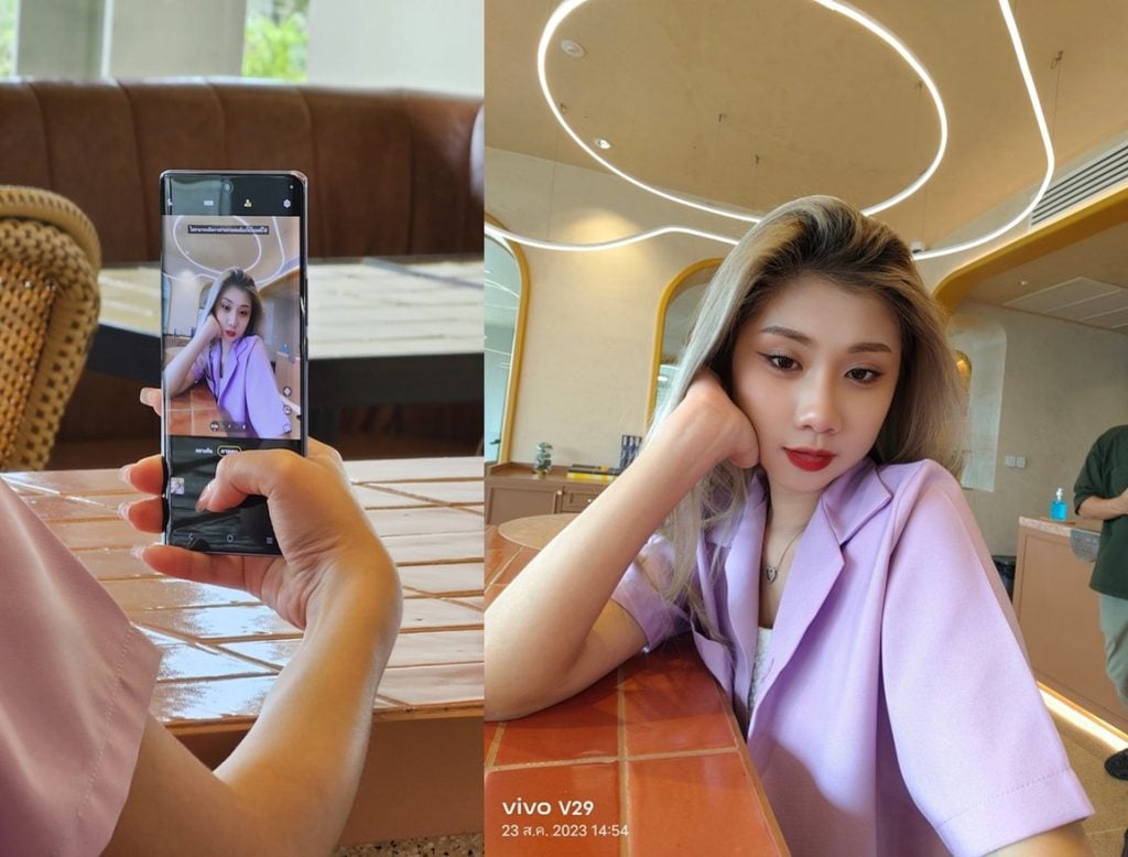 โมดูลใหญ่มาก กล้องหลัก 50MP และ Ultrawide 8MP กล้องเซลฟี่ 50MP กล้องมาโคร 2MP ที่ด้านหลังหายไปแทนที่ด้วย Aura Light Portrait 2.0 ที่อัปเกรดให้วงแหวนใหญ่ขึ้นกว่าเดิมถึง 9 เท่า ให้แสงออร่าได้สว่างยิ่งขึ้นถึง 36% และอีกจุดที่โดดเด่นของ V29 เลยคือการปรับอุณหภูมิแสงให้รูปถ่ายเก็บบรรยากาศรอบๆ ได้อย่างเป็นธรรมชาติ คมชัด สีสมดุล อย่างถ่ายภาพพอร์ตเทรตโทนเย็น บรรยากาศภาพก็จะปรับแสงให้ออร่าในโทนเย็น นี่แหละสมาร์ทโฟนที่เก็บทุกความรู้สึกพิเศษๆ ได้